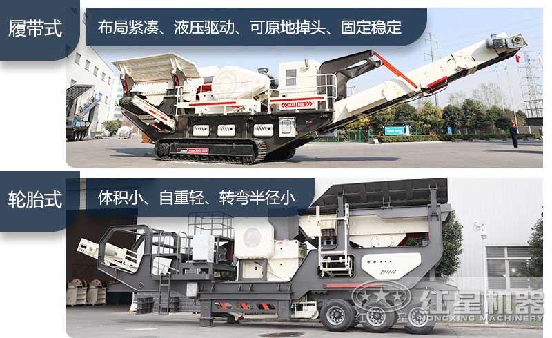 移动式轧石机可分为履带式移动破碎机和轮胎式移动破碎机两种形式的驱动方式。