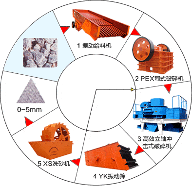红星制砂生产线由振动给料机、颚式破碎机、第三代制砂机(细碎机)、洗砂机、振动筛和胶带传输机等设备组合而成。根据不同的工艺要求,各种型号的设备进行组合,满足客户的不同工艺要求。